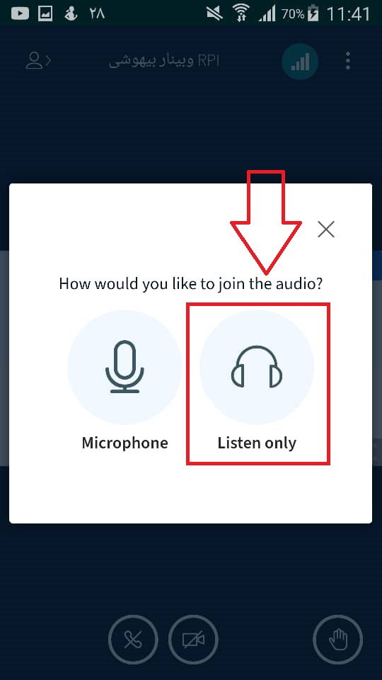 پس از ورود به وبینار گزینه ی LISTEN ONLY یا “فقط شنونده ” را فعال کنید .