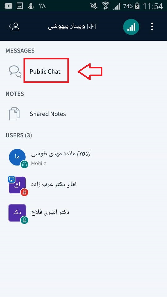 در صورت تمایل به نوشتن پیام در گفتگوی عمومی مطابق شکل زیر وارد PUBLIC CHAT شوید .